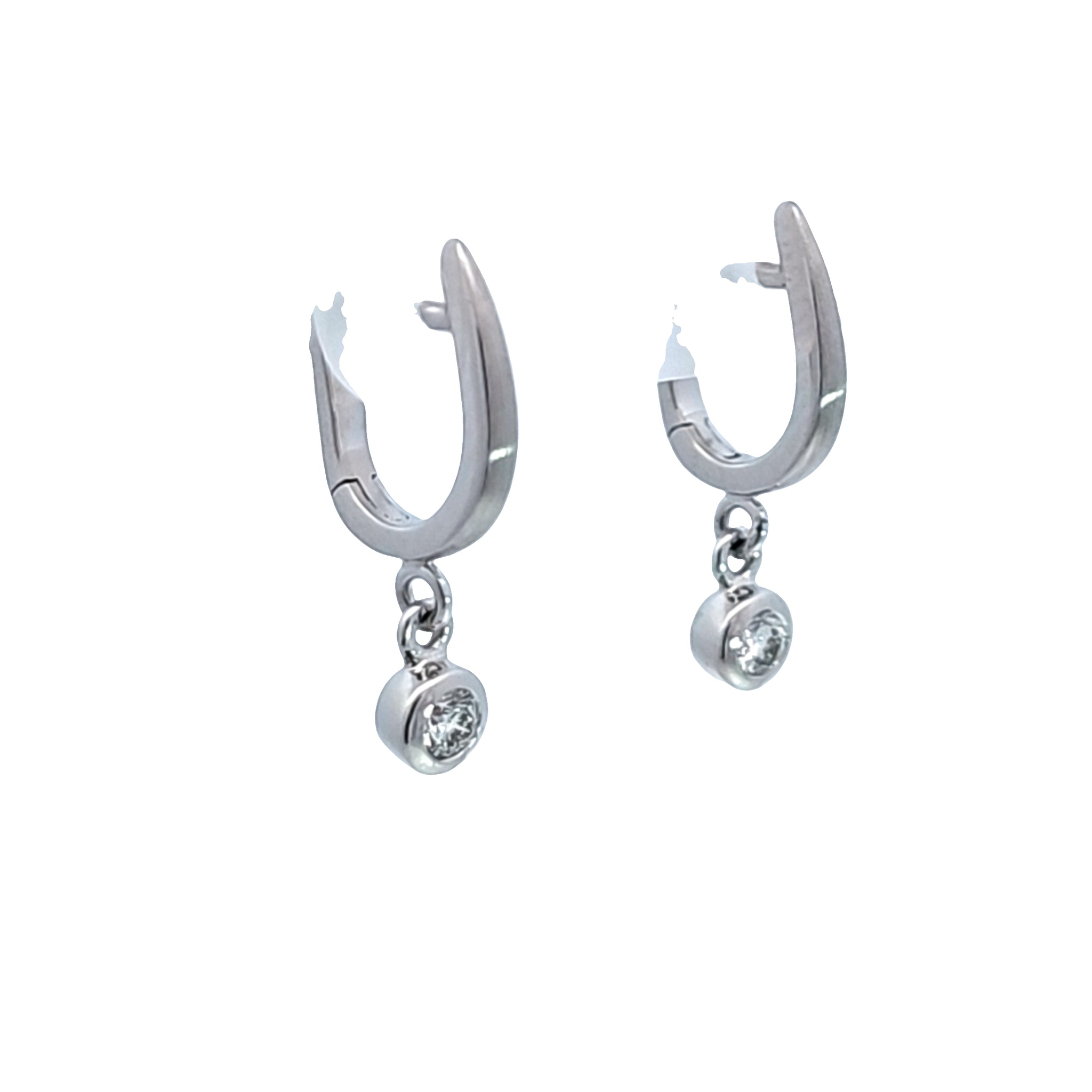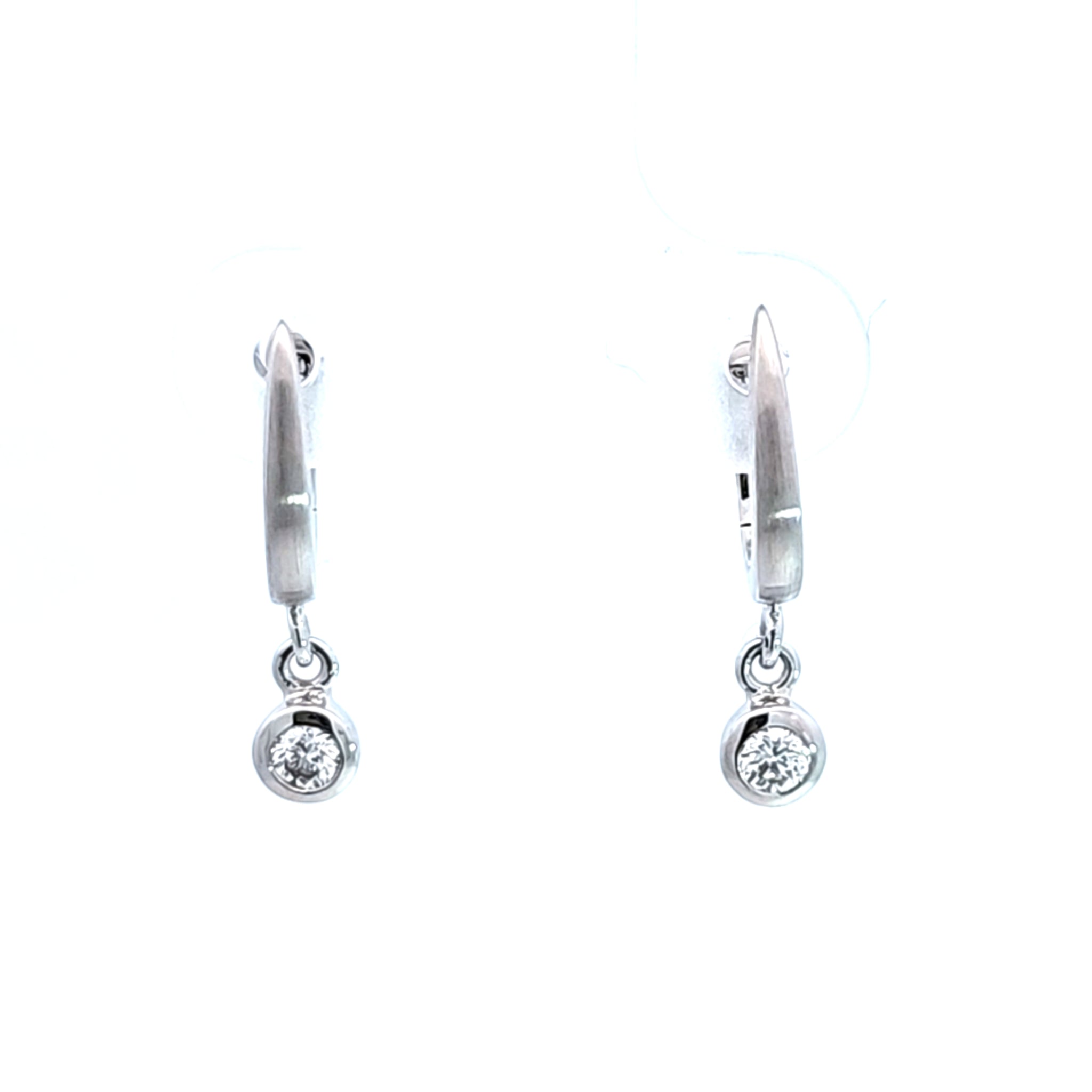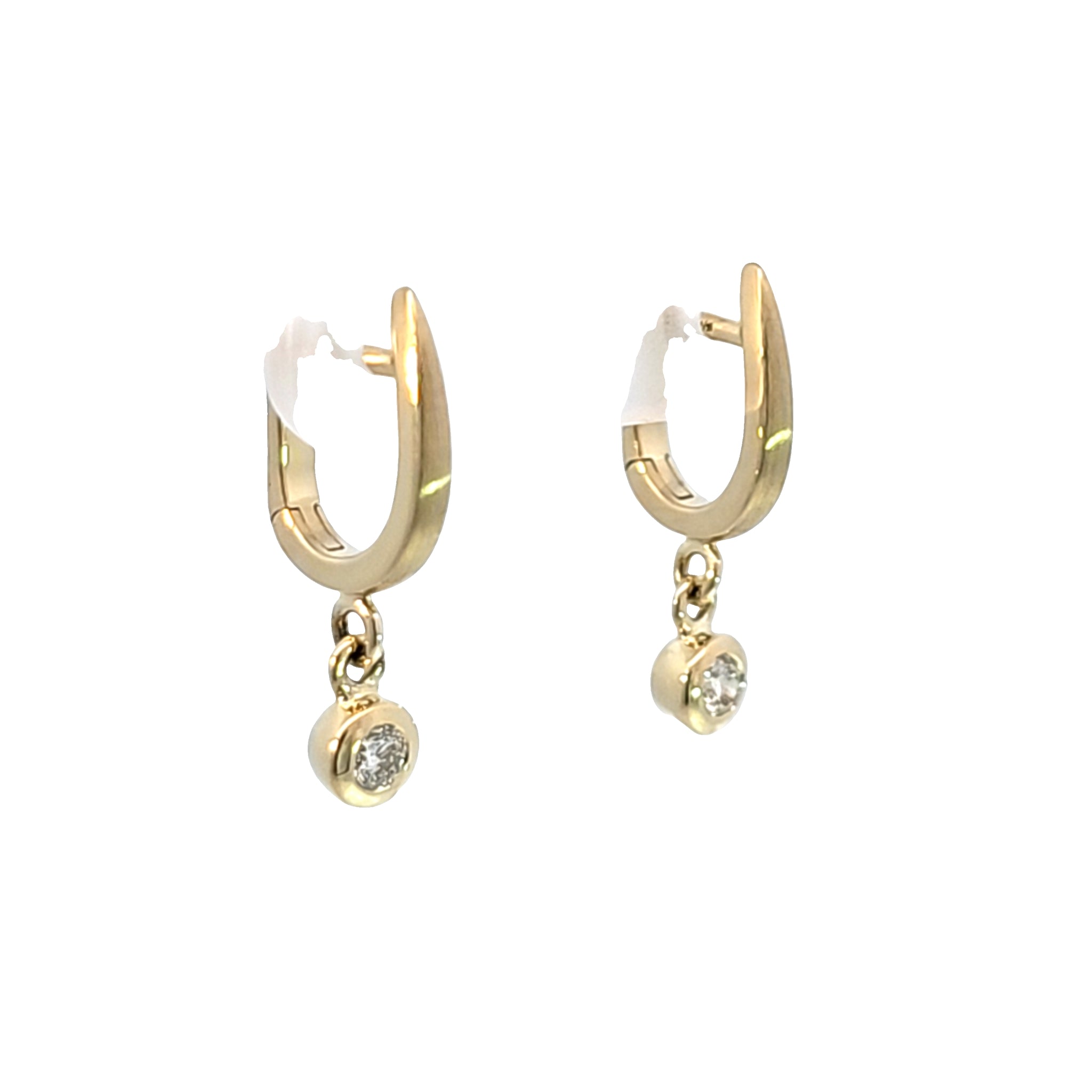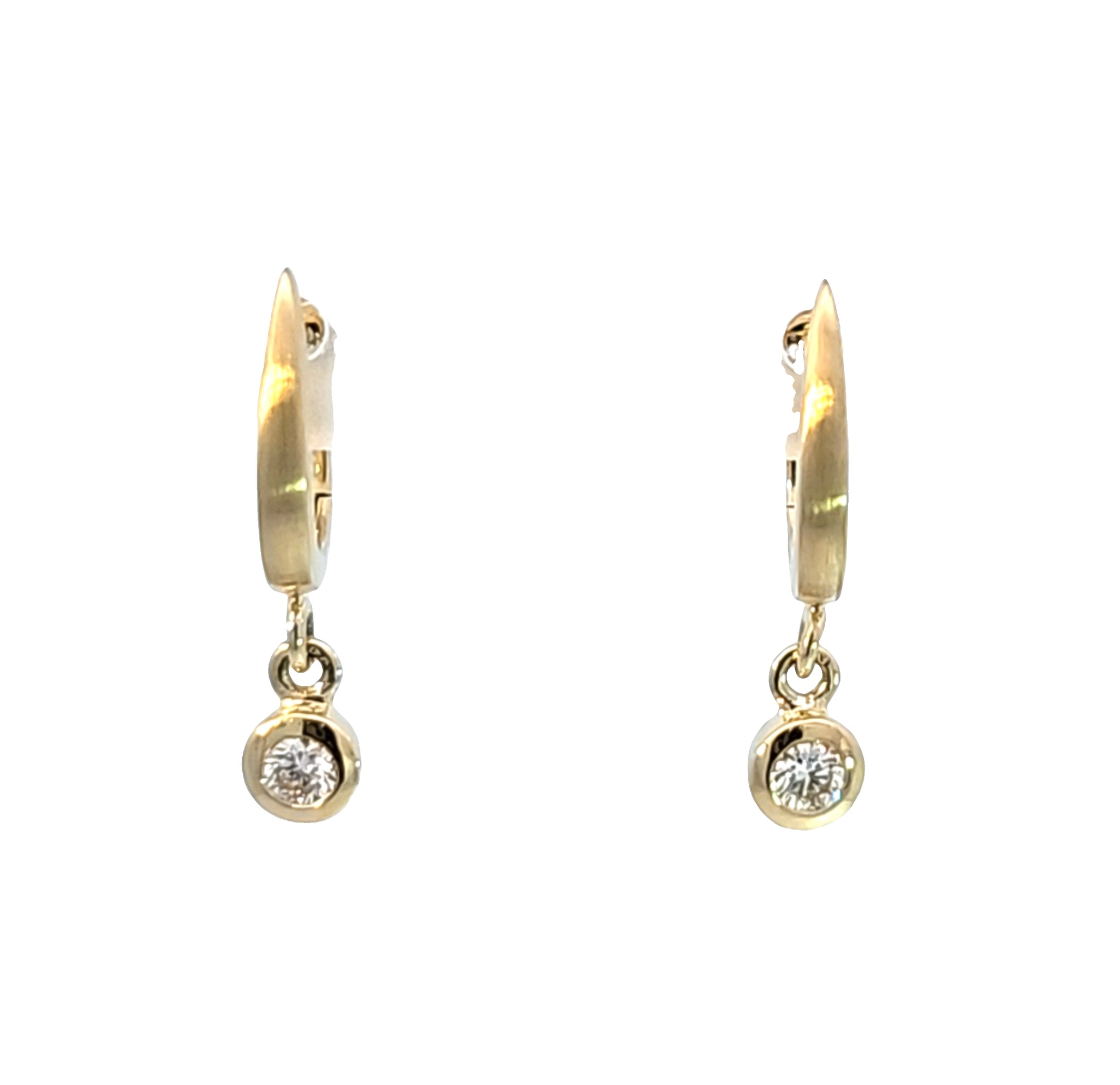 14k Yellow or White Gold Bezel Set .14ctw Diamond Drop Huggie Earrings. 1/2" drop from post.