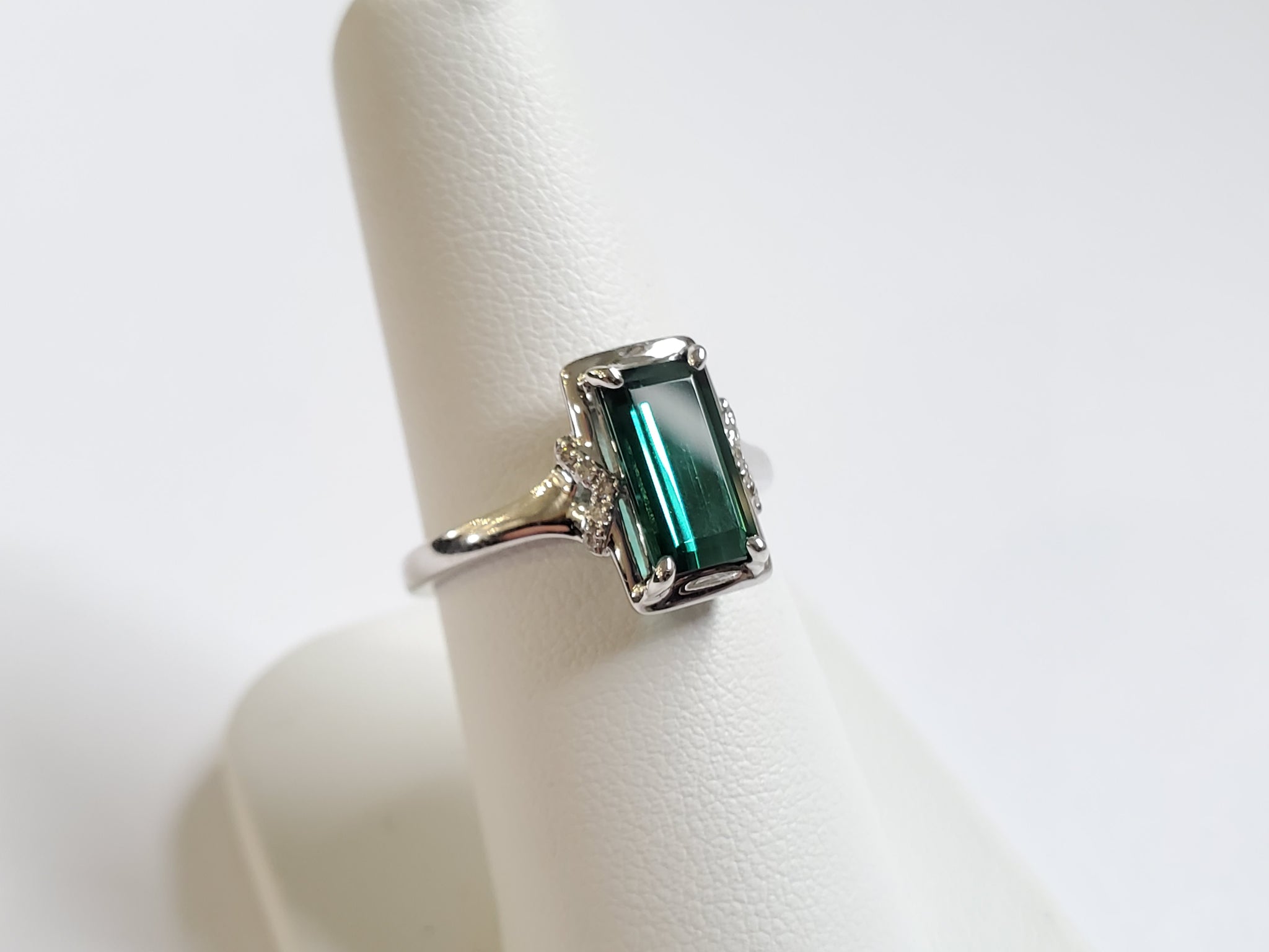 14k White Gold Vertically Set Rectangle 1.75ct Green Tourmaline & .06ctw Diamond Accent Ring. Size 7