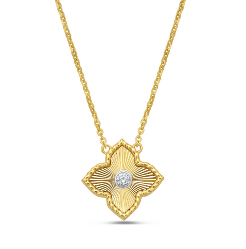 • 18k Yellow Gold Carved Flower Necklace with Bezel Diamond Center (I9903)
