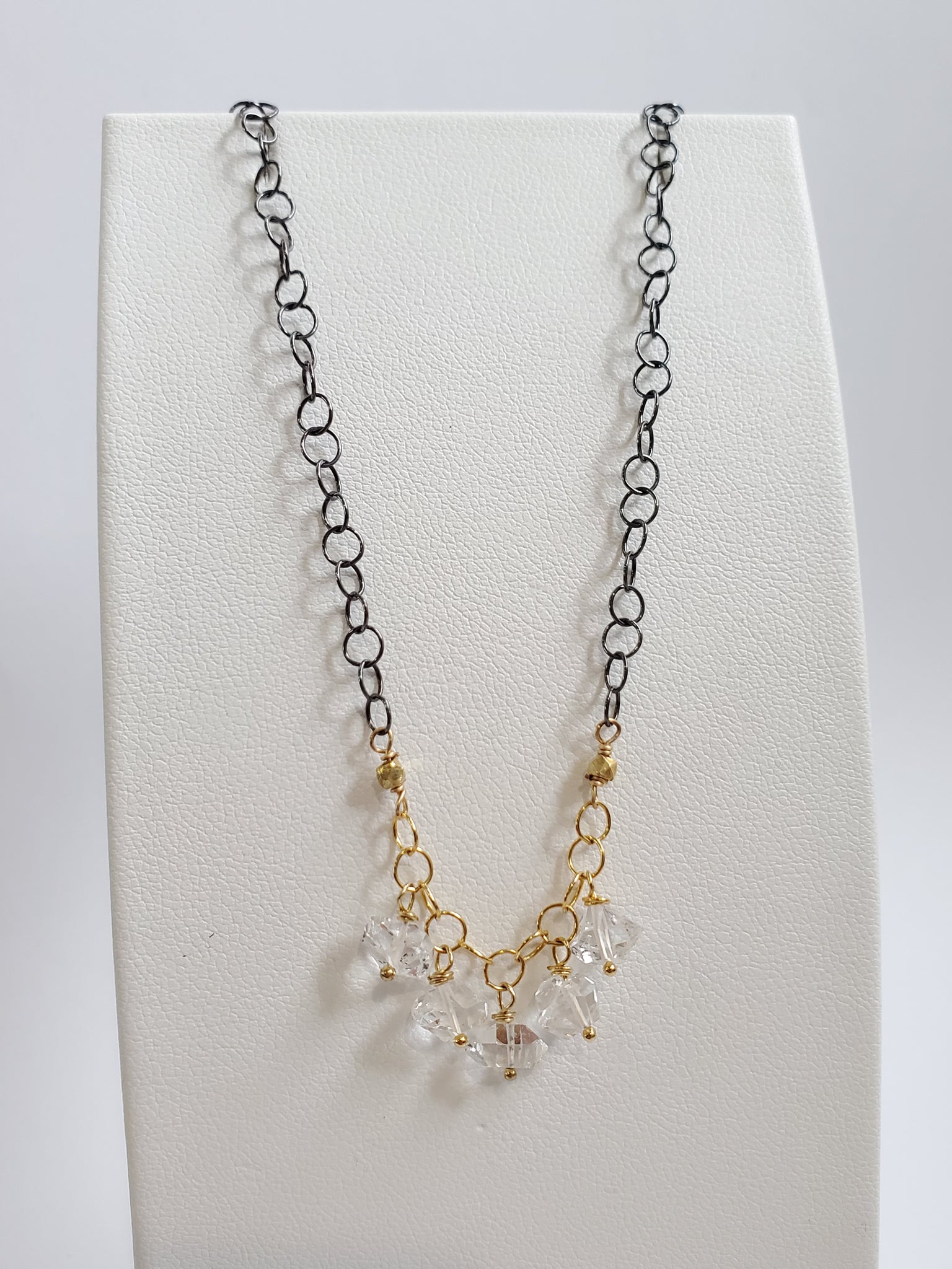 AVF Limited Edition Oxidized Sterling Silver with Gold Filled Accents Herkimer Diamond 5 Stone Dangle Necklace. 15.75" - 18" Adjustable Length.
