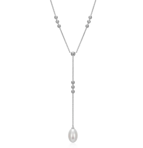 ELLE Rhodium Plated Sterling Silver Beaded Chain & Pearl Drop Y Necklace (SI8193)