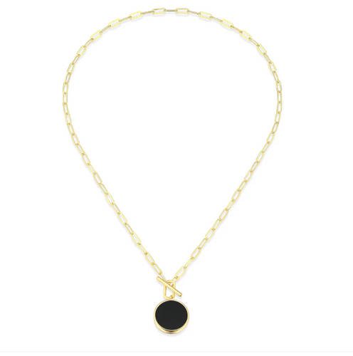 ELLE Gold Plated Sterling Silver Black Agate Disc Toggle Necklace (SI8435)