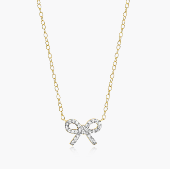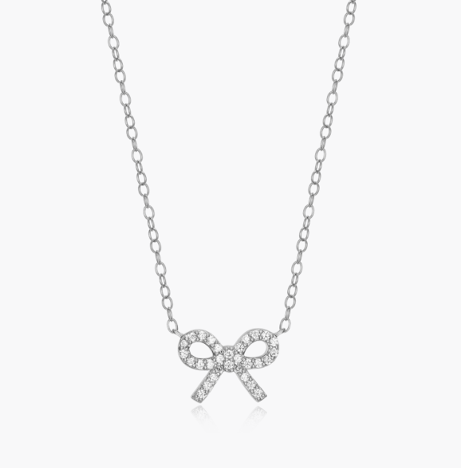Sterling Silver Rhodium or Gold Plated Lab-Created Diamond Bow Necklace. 16", 17" & 18" Adjustable Length