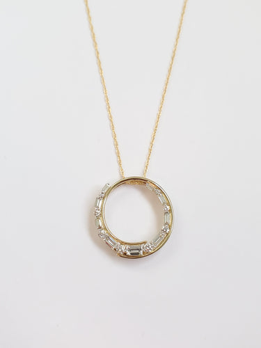 14k Two Tone Gold Graduating Baguette & Round Diamond Swirl Pendant (I9669)