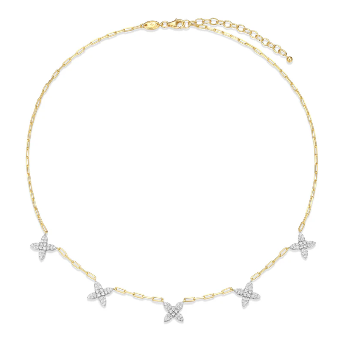 Rhodium Plated & Gold Plated Sterling Silver Two Tone CZ Flora Station Necklace. 17" - 19" Adjustable Length
