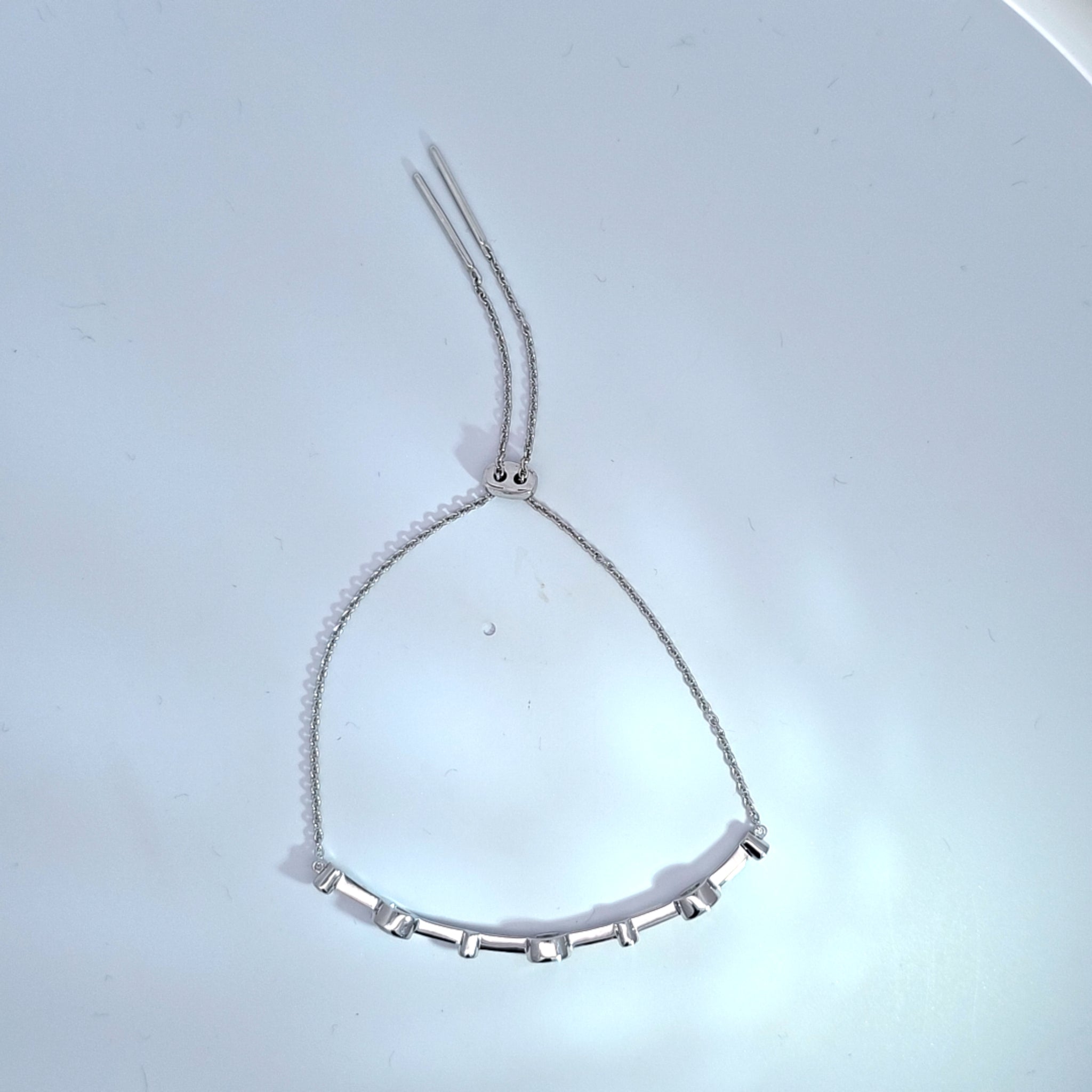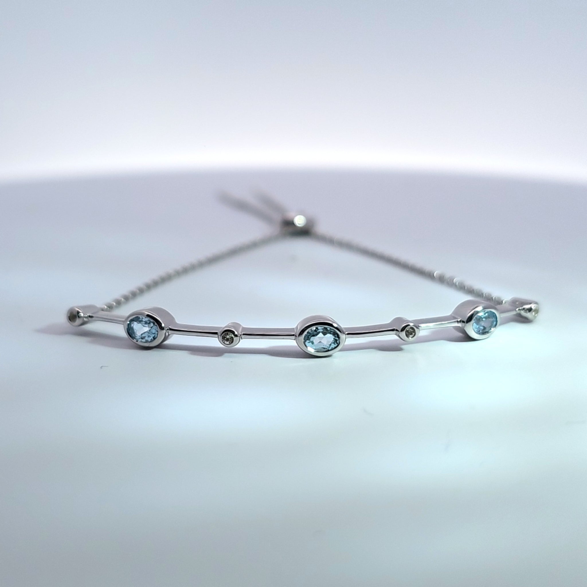 Rhodium Plated Sterling Silver Oval Blue Topaz & White Sapphire Station Bar & Chain Bolo Bracelet
