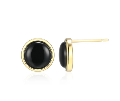 ELLE Gold Plated Sterling Silver Black Agate Button Stud Earrings (SI8343)