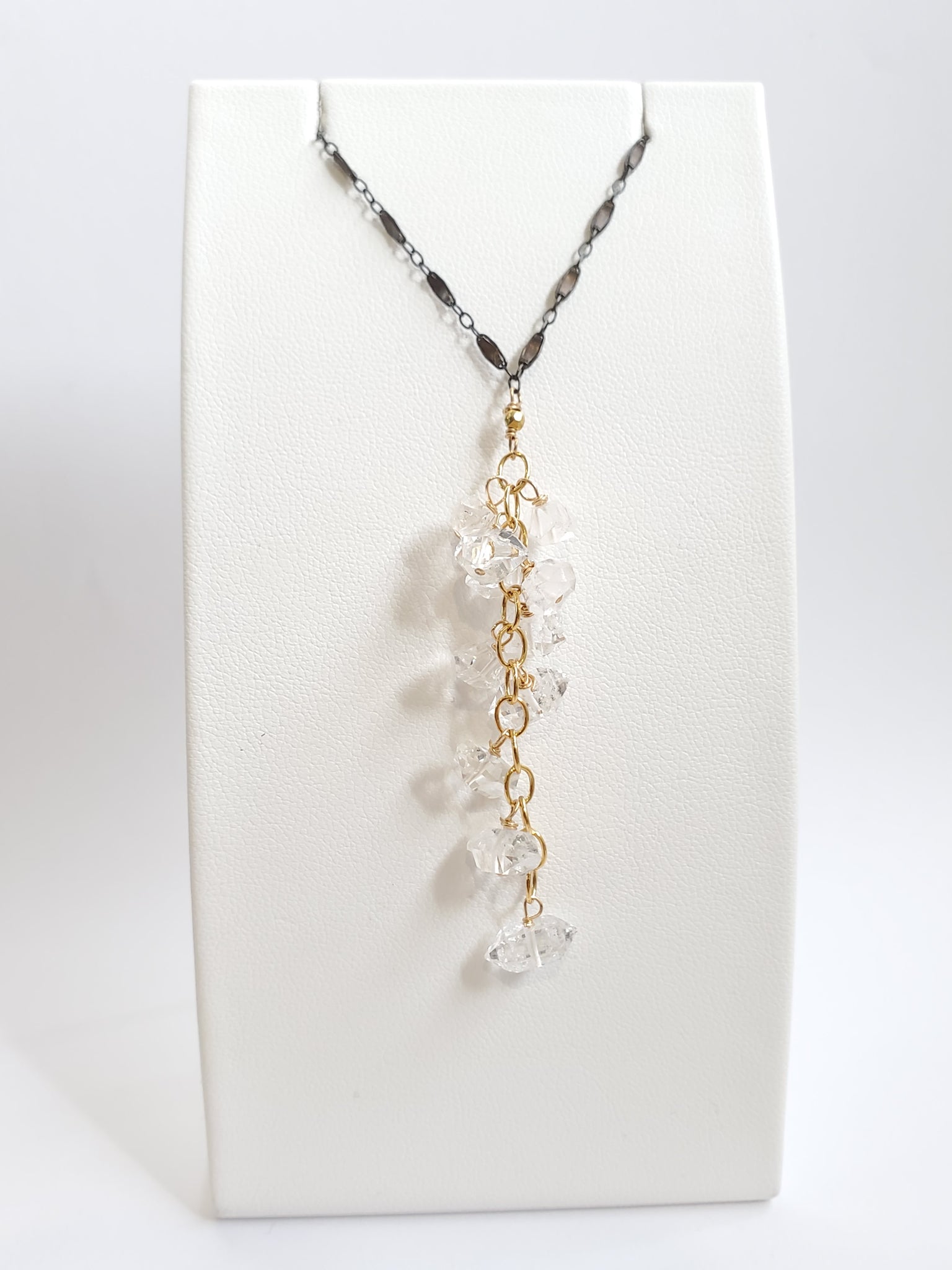 AVF Limited Edition Oxidized Sterling Silver with Gold Filled Accents, Herkimer Diamond Cluster Drop Necklace. 17.5" - 19.5" Adjustable Length. 2.5" Drop.